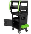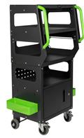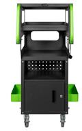 Višenamenska radionicka kolica sa četiri police sa ormarićem koji se zakljčava. Opremljena su sa dve ručke i okretnim točkovima koji omogućavaju veoma udobno i lako pomeranje. Kolica takođe sadrže perforirani panel, držač za papirni ubrus i dve bočne police za odlaganje alata. Pogodna su za postavljanje laptopova, testera i punjača baterija.TEHNIČKE KARAKTERISTIKE:Ukupan broj polica: 4.Nosivost gornje police: 20 kg.Nosivost srednje police: 20 kg.Nosivost donje police: 30 kg.Dimenzije perforiranog panela: 430 × 475 mm.Prečnik točkova: 101 mm.Broj točkova sa kočnicom: 2.Ukupan broj polica: 4